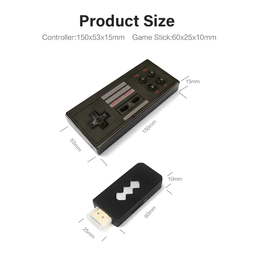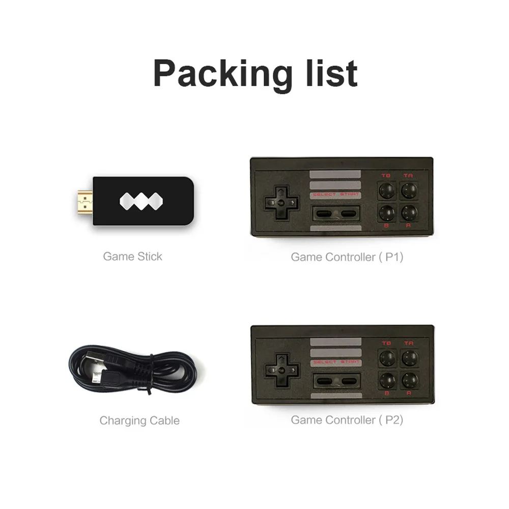 Type 12 * Wireless controller (without battery)1 * Game console1 * AV cable1 * Package box1 * English manualType 2 and Type 32 * Wireless controller (without battery)1 * HD game console1 * USB data cable1 * English manual1 * Package box