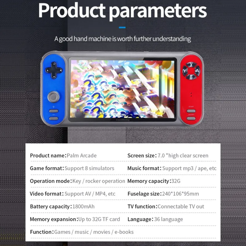 Size 26.7 * 13.7 * 6.13CMMemory 8GInterface type USBPlus function MP4 video playerFeaturesDisplay: 7.0 inches 800 * 480CPU: ATJ2279RAM: DDR1 512MMemory: 128MFunction: game / ebook / music / videoMusic function: support lossless music APE, MP3, WMA, DRM WMA, OGG, APE, FLAC, WAV, AAC (including AAC-LC, AAC HE, AAC + V1 / V2) and other full-format audioGames: perfectly support GBA, GBC, GB, SFC, FC, MD, NES, MAME format games,Language: 36 languagesE-book function: Support TXTOut put function: Support TF card expansion, up to 32 GBOther features: LR key using Omron key supports 3.5mm stereo audio headsetDisplay and free setting of various functional attributes such as energy saving settings, display brightness, interface backgroundExquisite appearance: The exquisite appearance and comfortable feel make you put it down.