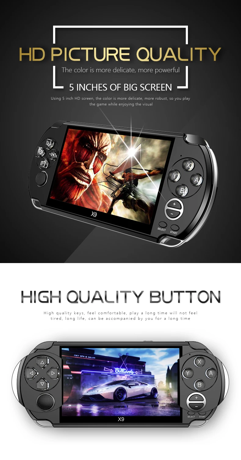 5.0 inch screen,HD 1080*720 screen ! the color is more delicate and more powerful! Let you enjoy the game while enjoying the visual. also support the AV television output !