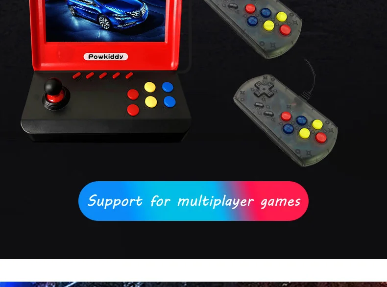 Brand Name: PowkiddyModel Number: retro arcadeScreen Size: 7.0 inchColor Display: yesTouch Screen: noPlace of Origin: Guangdong, China, PowkiddyColor: red blackScreen: 7.0 inchCPU: dual 528 MHLMemory: 16GBFunctions:games/ music/photoHow Many Games: Build-in 3000 gamesGames:support 64 bit multi-format gamesBattery:External 18650 2200 mh battery,can last for 5 hours.Accessory:Two wired joysticks,USB cable, AV cable,giftbox , user manualWarranty: 12 MonthsPackaging & DeliverySelling Units:Single itemSingle package size: 46*42*37cmSingle gross weight: 12.0kgPackage Type:powkiddy Retro Mini Arcade 7.0 Inch Screen3000 Built-in Game Support SD Card Two Free Joypads:Package: 12pcs/carton Weight: 12kg/cartonCarton Size: 46*41.5*36.3cm