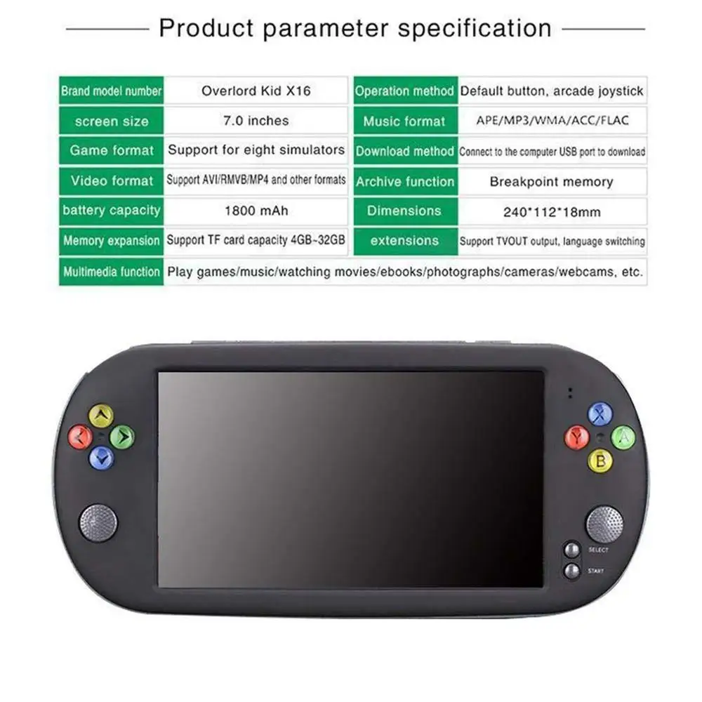 | X16 7 Inch Retro Classic Game Console Handheld Portable 1300 Built-in Games Color Screen Display Game Player |