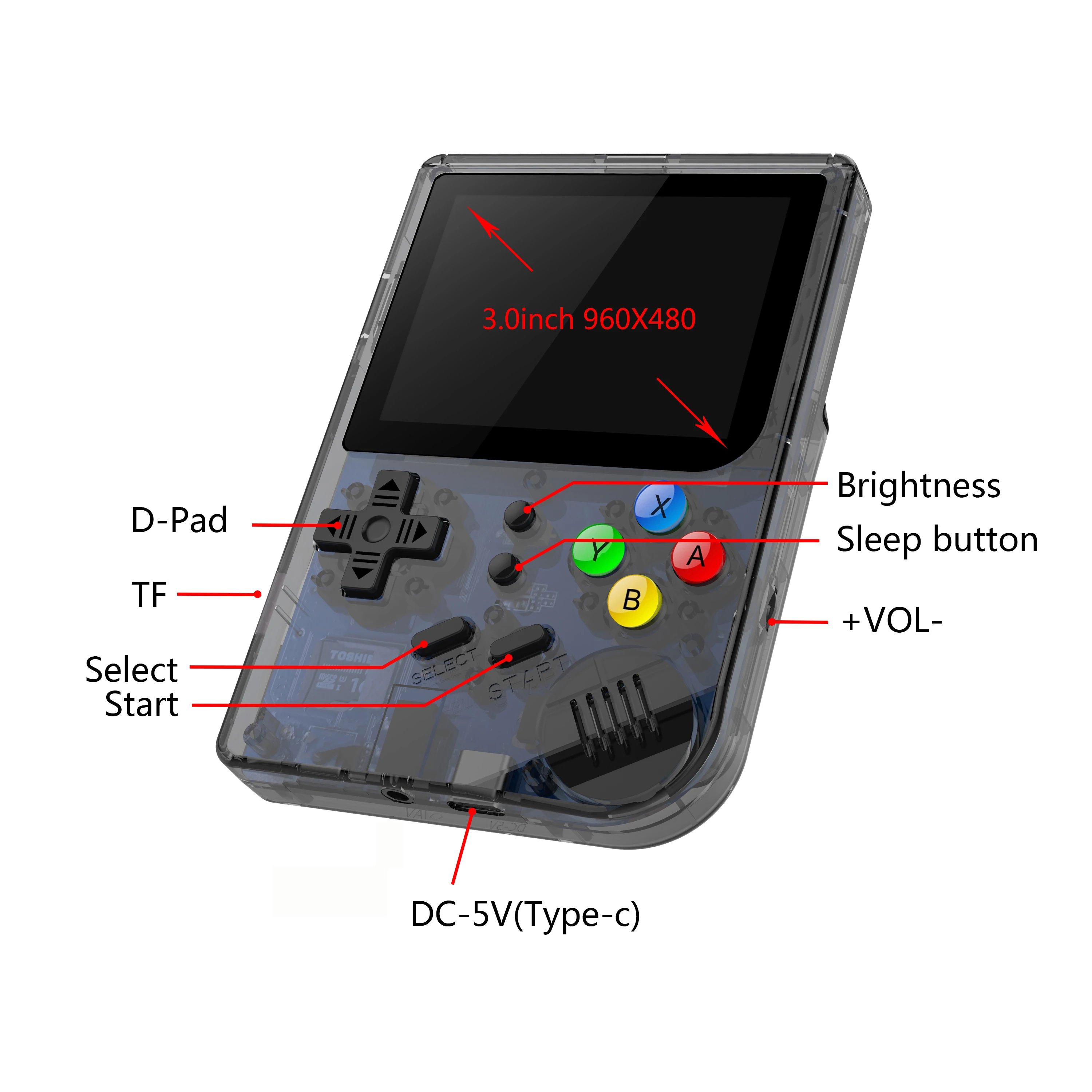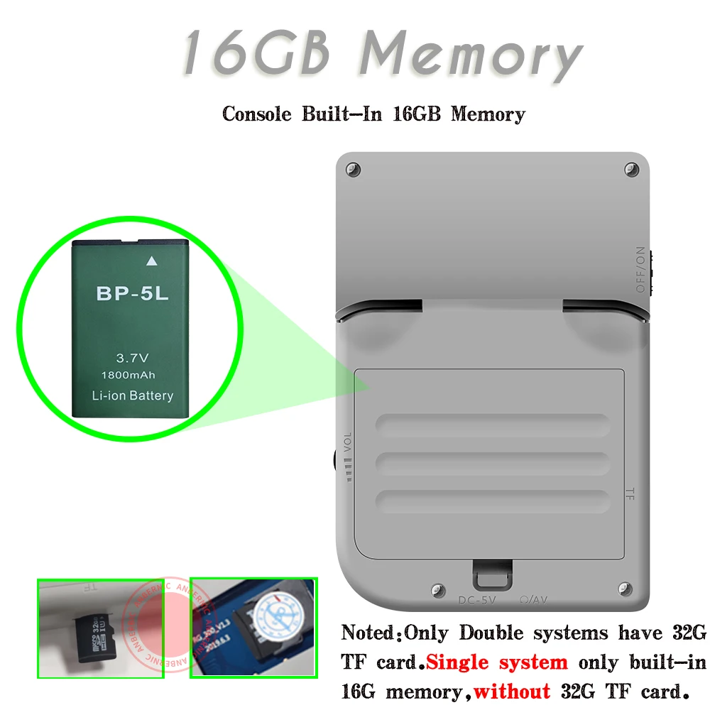 1.2.8 inch IPS full view Screen/960*480 (tempered glass); 2.dual 528MHz3.DDR2 128M 4.16GB memory5.Built-in 3000 games perfectly support Arcade games /CP1/CP2/NEOGEO/GBA/SFC , MD,GBC/GB/classic FC and other format games.Support the user to download the relevant format game.6.multi-language (Chinese,English,Japanese,Korean,Spanish,Portuguese,Russian,Italian,french ,German etc.) 26 kind of language7.External BL-5B 1800 mh battery last for 6 hours8.Support tf card max to 32GB9.L R button of Omron , support 3.5mm stereo earphones.