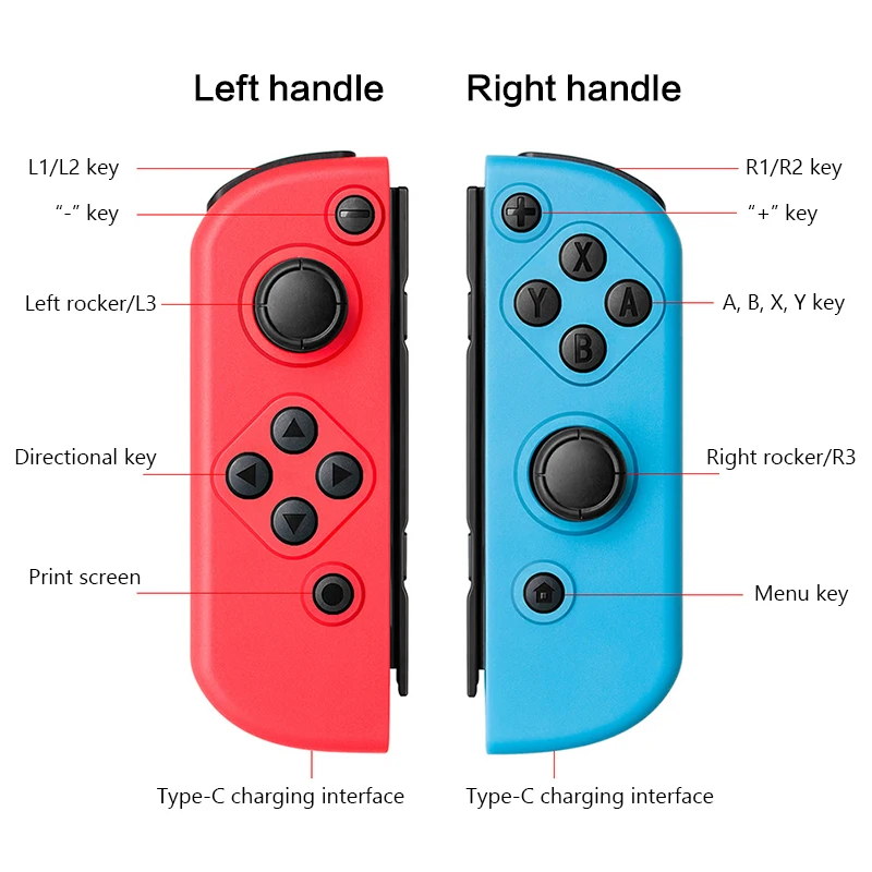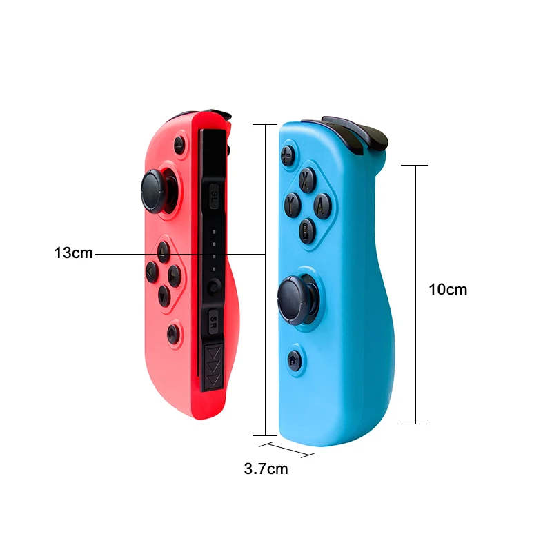For Switch Joystick Controller for Nintendo Joystick game Console Left Right Bluetooth Wireless Gamepad Switch Accessories Controllers Description: Item type:Gamepad console This controller is designed to Switch the game host, with functions of vibration and accelerometer, can be connected through cable and bluetooth wireless connection to a Switch mainframe can be connected at the same time at most seven handle (four left handle [blue] and three the right handle [red] or 3 left handle [blue] and four right handle [red]). The handle is composed of 24 keys and 2 3D remote rods with high precision. Left handle [blue] consists of up, down, left, right, screen capture key SL key, SR key, Mode key, L1 key, L2 key and left remote lever. Right handle [red] consists of A key, B key, X key, Y key, + key,Home key,SL key, SR key, Mode key, R1 key, R2 key and right remote bar. Switch host Settings: Turn on the Switch host, select "Settings" from the menu, successively select "system Settings"→ "flight mode" → "handle connection", and then turn on bluetooth. Switch host via bluetooth: A. Open the handle by pressing the left handle [blue], any up, down, left, right and right handles [red], any a,B,X,Y keys, and at the same time, 4 color LED lights will flash in a cycle. B. Hold down the "Mode" button of left handle [blue] or right handle [red] for 3 seconds, and the LED light will keep flashing and enter bluetooth pairing Mode. C. return to the main screen of Switch host, select "gamepad, controller" on the menu, and then select "Switch gamepad mode". The host will automatically search for a matching gamepad. After successfully connecting the gamepad, press A key, select "close", and then enter the menu to play the game. Automatic continuous connection: If the Switch host has been connected with the handle, and the bluetooth of the host has been turned on, the Switch host will be automatically connected after the handle is turned on. 3-Feature After the handle is connected successfully, the current 30mA Vibration current 80mA Off current 15mA Battery Capacity:400mAh Battery life: with vibration effect 10 hours, without vibration effect :20 hours Charge current 350 MAMAX Maximum voltage during charging :DC5V 1A Bluetooth effective distance: approximately 10 meters Package Include: 1x Gamepad console 1x Type-c cable 1x Instruction manual Note: The colors deviation might differ due to different monitor settings.