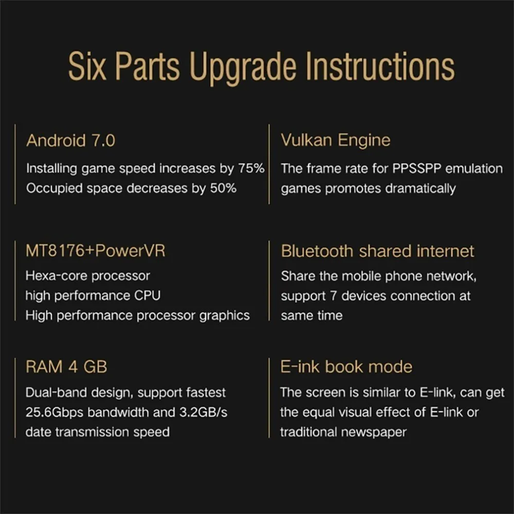 Android 7 system, MT8176+PowerVR processor, Bluetooth share Internet access, 4GB memory, electric paper book mode.
