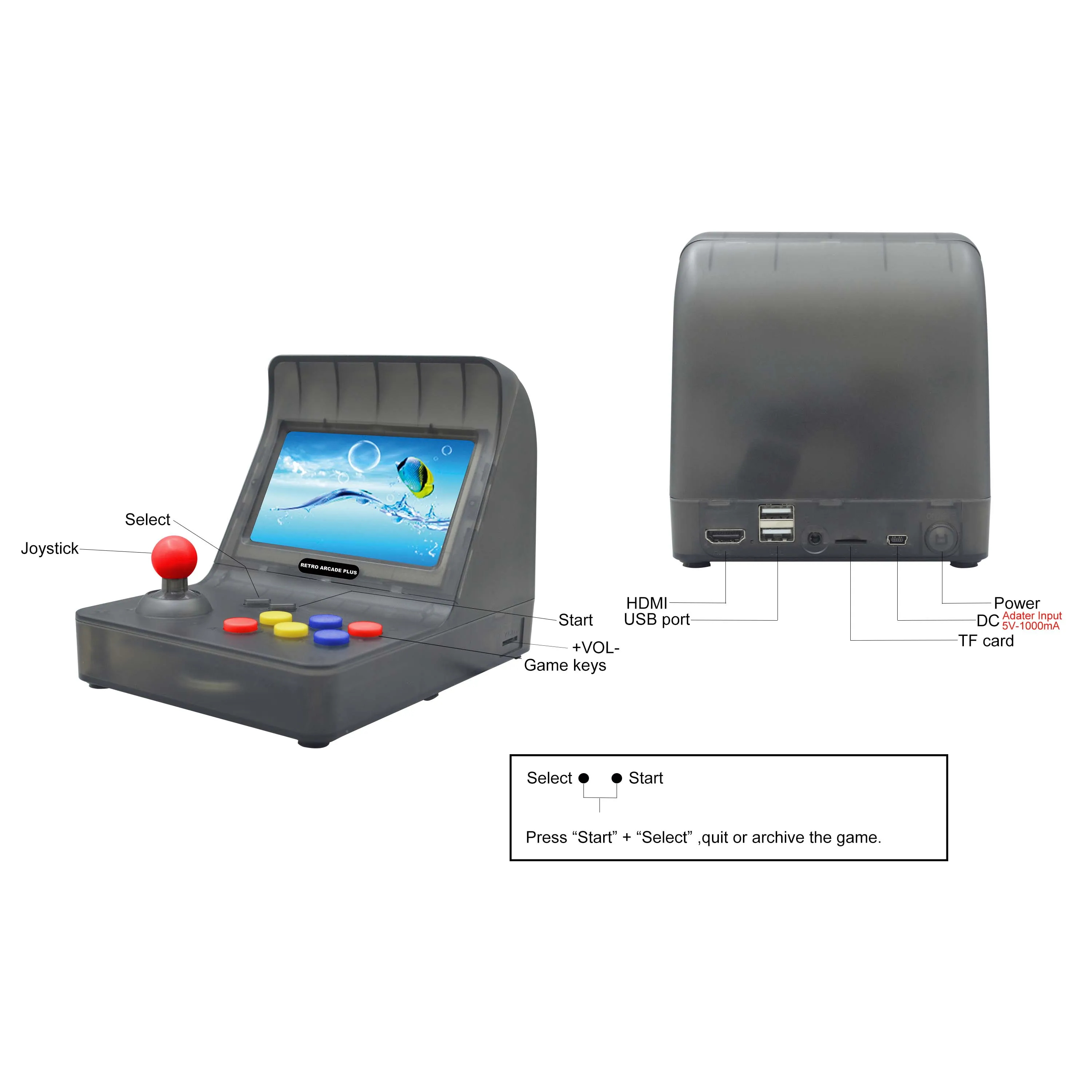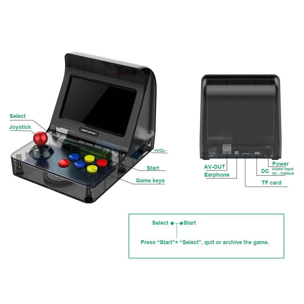 1.4.3 inch/480*272Full View TFT Screen.2.CPU: ATM7051-4 core A5-1G ; Memory:16 GB -3000 in one.3.Function:Support 4K HDMI,1280*720p 60Hz games speed FPS 1:1 output4.Built-in 3000 games perfectly support:Arcade CP1、CP2、NEOGEO、GBA、SFC,MD,FC,GBC、GB and other format games.Support the user to download the relevant format game5.Language:English and Chinese6.Battery:External 18650 2200 mh battery,can last for 5 hours.7.Support tf card max to 32GB8.Support TV HDMI output, support 3.5mm stereo earphones.energy saving setting, display brightness, interface background and other functions of display.9.One wired joysticks,USB cable, HDMI cable,giftbox , user manual