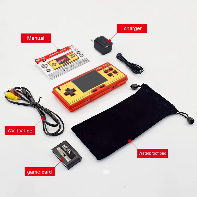 1 *Game Console(built in battery)1 *Mini Game Card1 *EU Plug1 *AV Cable1 *Waterproof Bag