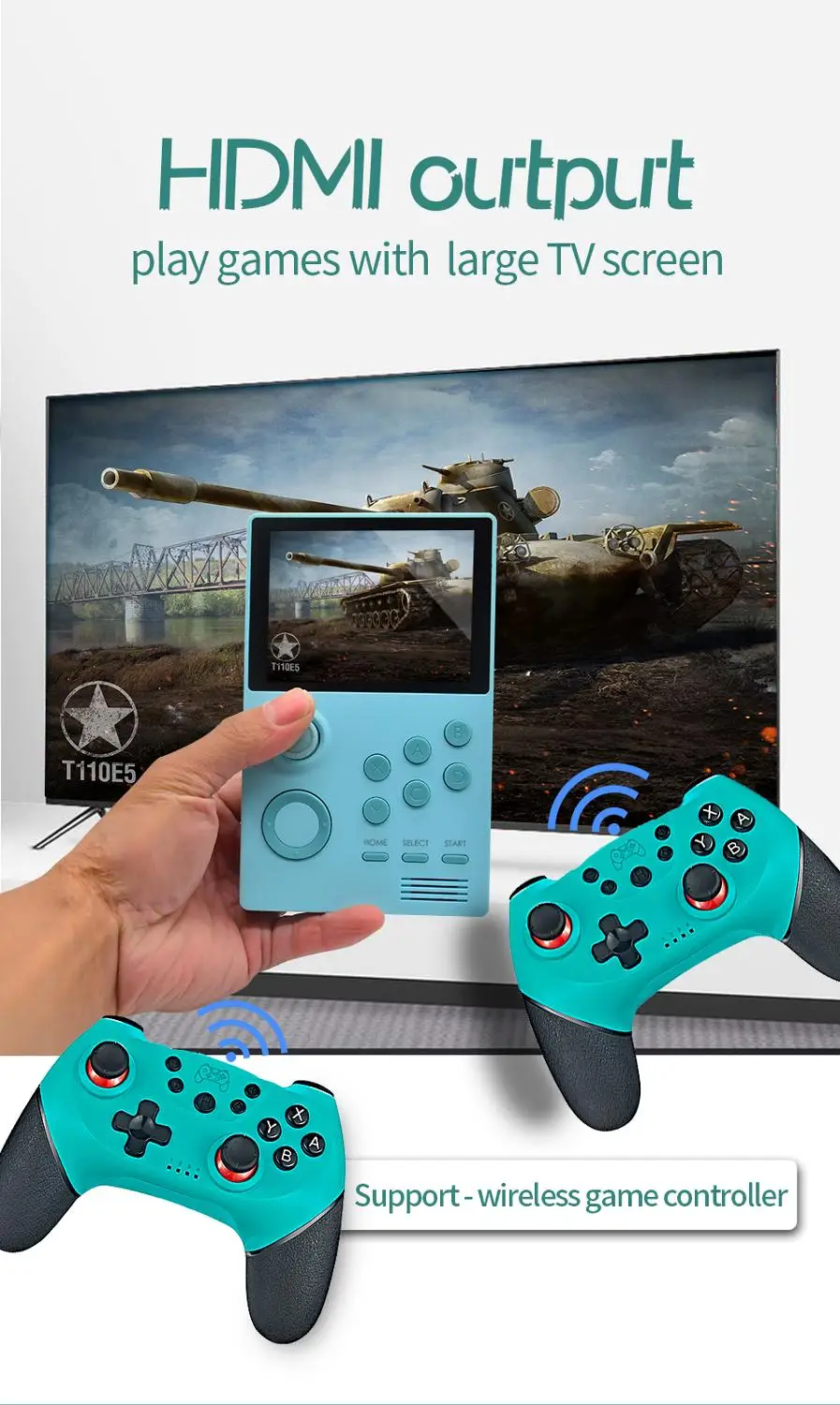 Dear friends, if you have any questions, please feel free to consult our customer service. If you cannot contact our customer service, you can contact WeChat: lmm920129 We will do our best to solve your problems and provide you with the best service ~--Our guarantee service1.Accept Dropshipping, and we will DO NOT put any invoices, QR codes, promotions in the shipment, So Dont worry, Just buy it, we will do anything well for you .2.We are guarantee each device be tested rigorous before shipped out, SO all products can guarantee 100% high quality before sent out.--Parameters:Product Category: Handle game console Interface type: USBConnection method: WifiNetwork interface :BluetoothVideo / audio interface :HDMIoperating system :Open sourceMemory :32GBuilt in game :2335 include 3D gamesColor :Mint /Yellow /White --Features :1. Built-in 3000 games, including 30 3D, support memory card expansion2. Symphony body, three colors are optional3. Support Wifi connection, games can be updated4. Support Bluetooth controller, make playing more comfortable5. Support HDMI high-definition output, big screen in seconds6. Standard battery life of 6 hours7. For FC SFC DC PSP WS.WSC MAME FBA PS MD GBA PCE N64 emulator game --Packing list :1 *Game console +1 *USB cable+ 1*Retail package boxOnly the above package content, other products are not included.--Note: Light shooting and different displays may cause the color of the item in the picture a little different from the real thing. The measurement allowed error is +/- 1-3cm.