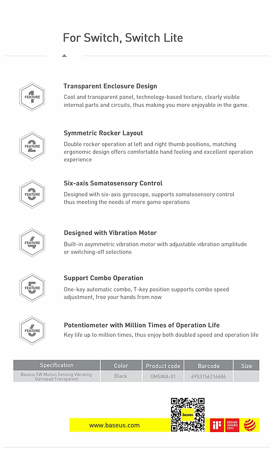 Fully Transparent Somatosensory Vibrating Controller For Nintendo Switch/ Switch Lite Wireless Adaptation