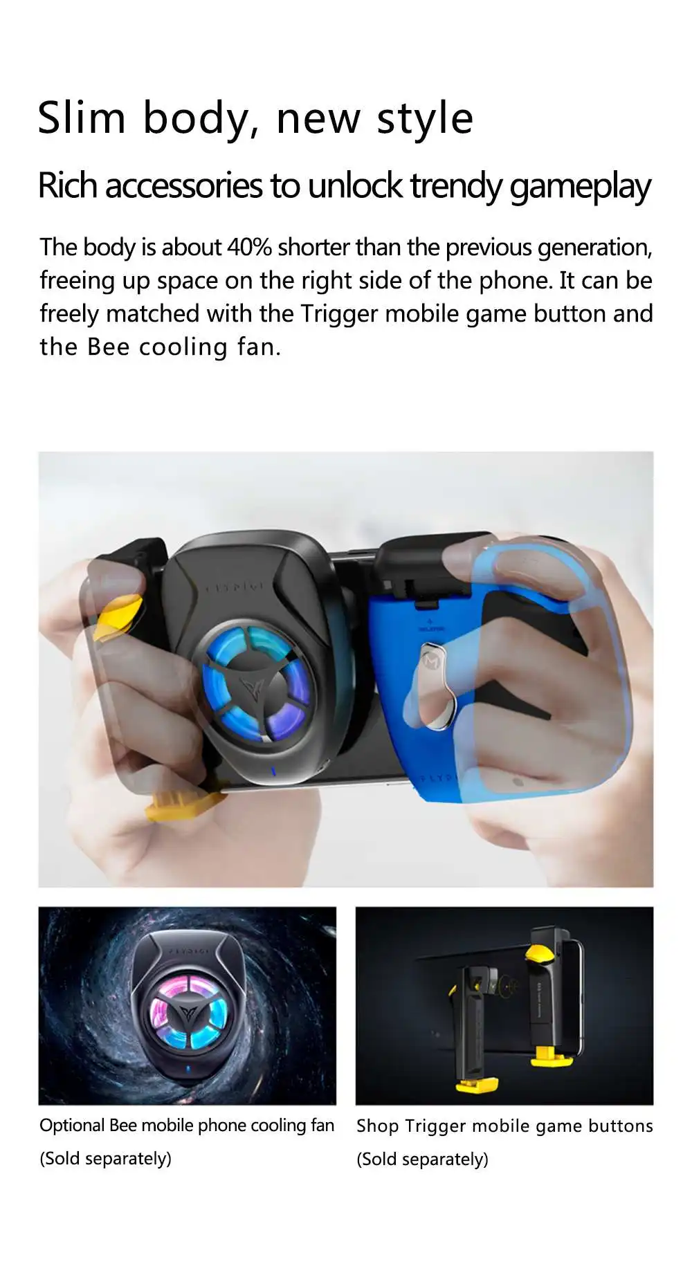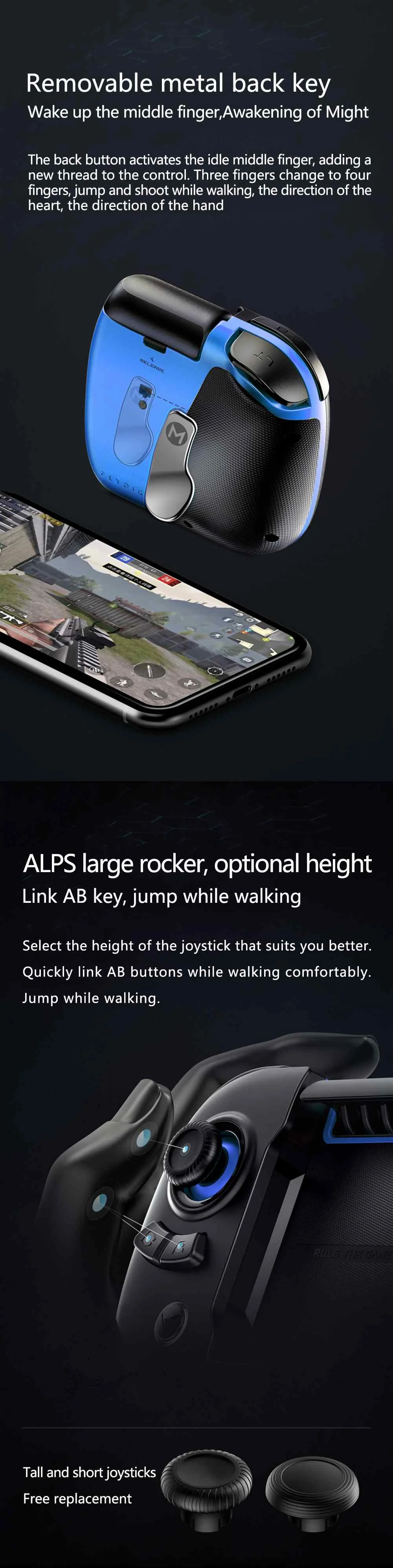 Features: Built-in six-axis gyroscope, somatosensory micro-operation, adjustable sensitivity Removable metal back button, the back button activates the restricted middle finger and adds a new thread to the operation ALPS big joystick, choose high or short; linkage AB key, jump while walking Flashplay TM Bluetooth smart connection technology, both for APPLE and Android support, support for mobile phones within 86mm width Built-in Type-C small tour activation line, Android mapping activation anytime, anywhere 80 hours of endurance