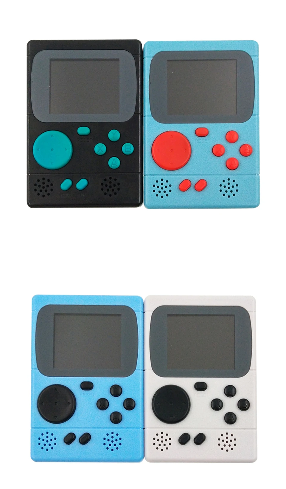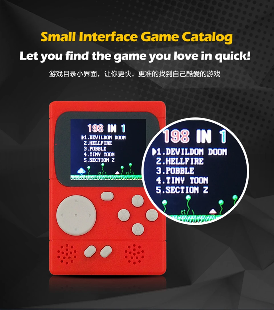 Item Name:Retro Mini Game Console Model No:GC36(2.4inch TFT Screen)Built-in games:198 pcsDimensions:10.1*6.9*2.33CMPackage Size:14*9.8*5.7CMPackage Weight:about 230g/PCCarton Weight:about 24kgs(100PCS/CTN)Carton Size:60X31X52CMFeatures1. Built-in 198 classic games2. Perfect size design, comfortable key feel3. Unique design 100% new quality shell4. Frosted texture, embossed silk screen, Color:Black / White / Blue / Red / Green /Light blue / BrownPacking List1*Mini Game Console,1*Charging Cable,1*Manual,1*Package Note:please note package exclude battery,please buy AAA battery after received parcel.