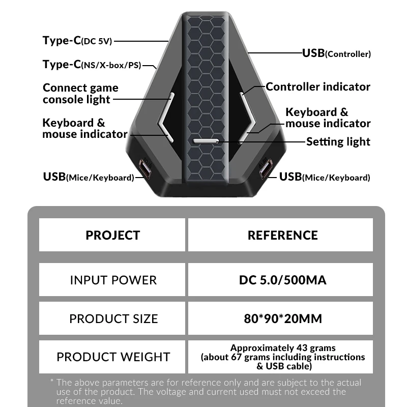 Humanized design with Non-slip Handle, you can use your device by rotating vertically and horizontally without smashing easily.Protective handle has super drop resistance effect.The camouflage design makes your handles better in front of gamers! DATA FROG 2.4G wireless video game controller adopts HDMI output design, which can provide buyers with better high-definition images, so you can find happiness in the game, and will not affect your happy mood. This handle we designed a vibration motor, when you are playing a racing game, the brake drift action is more exciting! Immerse yourself in a happy game and can't extricate yourself! Happy games make you forget your troubles! DATA FROG Gaming Keyboard Mouse Converter PUBG Mobile Gamepad Controller USB Adapter For Nintend Switch/PS4/PS4XBox One/Xbox 360 This product is mainly suitable for the keyboard and mouse wired connection for P3/P4/X1/N-Switch game console for game operation, especially suitable for playing FPS games. 1. Support P3, P4, X1, Switch original handles are wired and connected to the corresponding game console through the converter.2. The first Mike USB port is the DC5V power input jack. A 5V power supply can be connected when the lantern keyboard is needed, and other devices do not need to be connected to a power source.3. The second Mike USB port is used to connect to the host USB port and connect to the game console via the USB cable. The USB interface labeled with the handle is the handle interface for connecting to the original gamepad and must be wired for use.The USB interface labeled Keyboard/Mouse is a keyboard and mouse interface for connecting a mouse/keyboard to a converter. 1. Plug the USB data cable into the second Mike port of the converter and connect it to the USB port of the game console. The corresponding indicator is always on.2. Insert the corresponding original handle into the corresponding handle USB port, and the corresponding indicator light is always on, indicating that the connection is successful.3. Insert the USB head of the mouse and keyboard into the corresponding USB port of the converter, and the corresponding indicator light is always on, indicating that the connection is successful.4. When needed, you can use a 5V power supply cable to connect to the converter's first Mike USB interface to power the converter. 1. Press the keyboard F11 and F12 at the same time to enter the setting mode. The setting mode corresponding status LED is always on.2. First press and hold the function button on the handle, press the button on the keyboard or mouse to be set (the button only supports the single button corresponding function), the 3D joystick is up, down, left and right. Push to the end (supports the upper, lower, left, and right directions), the cross key is set in the upper, lower, left, and right directions.3. Then release the button on the handle, press the keyboard F11, F12 at the same time to enter the setting mode, the setting mode LED is off. The button setting operation is completed.Note: If you do not press the handle function button during the setting process, the button function originally set on the keyboard or mouse will be cleared. 1. Press the keyboard F11 and F12 at the same time to enter the setting mode. The setting mode status LED is always on.2. Push the left 3D or right 3D direction to the bottom (up, down, left, and right), shake the corresponding direction in 3D, and then slide the mouse (the mouse only supports the function of the left 3D or the right 3D)3. Press the keyboard F11 and F12 at the same time to enter the setting operation mode. The setting mode LED is off, the mouse is finished and then exits the setting mode, and the mouse setting mode operation is completed.4. Mouse sensitivity selection: F12 + 1 is the lowest sensitivity, F12 + 9 is the highest sensitivity. 1-9 is the numeric word key above the English letter.Note: The setting contents are automatically saved when leaving the setting mode. Dear customers, because the current order is at the peak of the order, all the logistics warehouses are almost full, and the transportation aging time will be slower than the promised time! The phenomenon of customer's parcel loss will be very serious, affecting the normal delivery time! DATA FROG can return to your side as soon as possible for your beloved products. We have made comprehensive considerations on the transportation aging and transportation safety of different logistics channels. Together with our experience over the past few years, we think Aliexpress Stand Shipping is the best fit! Conscience recommended! DATA FROG's latest version of the gamepad, do you feel very retro with childhood taste? I guess the answer must be! Our design philosophy starts from the trend and trend of the times, and widely accepts the opinions of customers to introduce this control handle for everyone! This gamepad for switch uses a dual motor vibration function, so you really feel the excitement of the game! This wireless controller is compatible with the Nintend Switch console.It supports Gyro axis function and dual motors double-shock function!Give you a gamepad and remember the memories we have lost! The DATA FROG gamepad is a Bluetooth-connected operating mode. It can support for PS3/IOS/TV Box/Andriod Smart Phone/PC!It has the advantage of being able to download the support handle game directly, and it can be connected directly to the phone without ROOT. The steps are simple, no need to install drivers and set up key mapping.