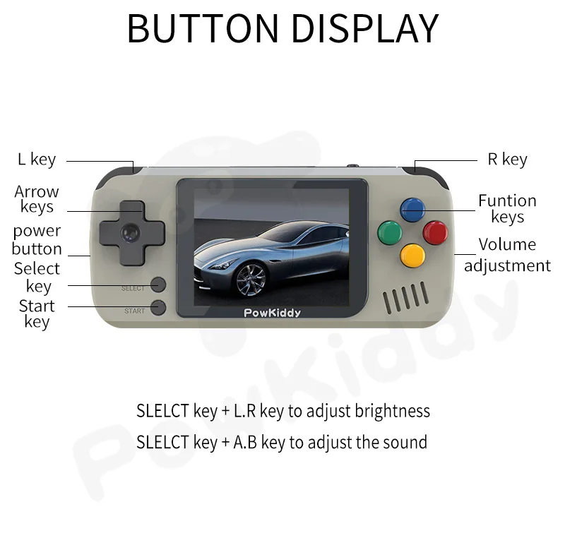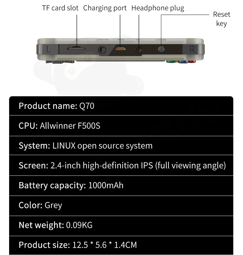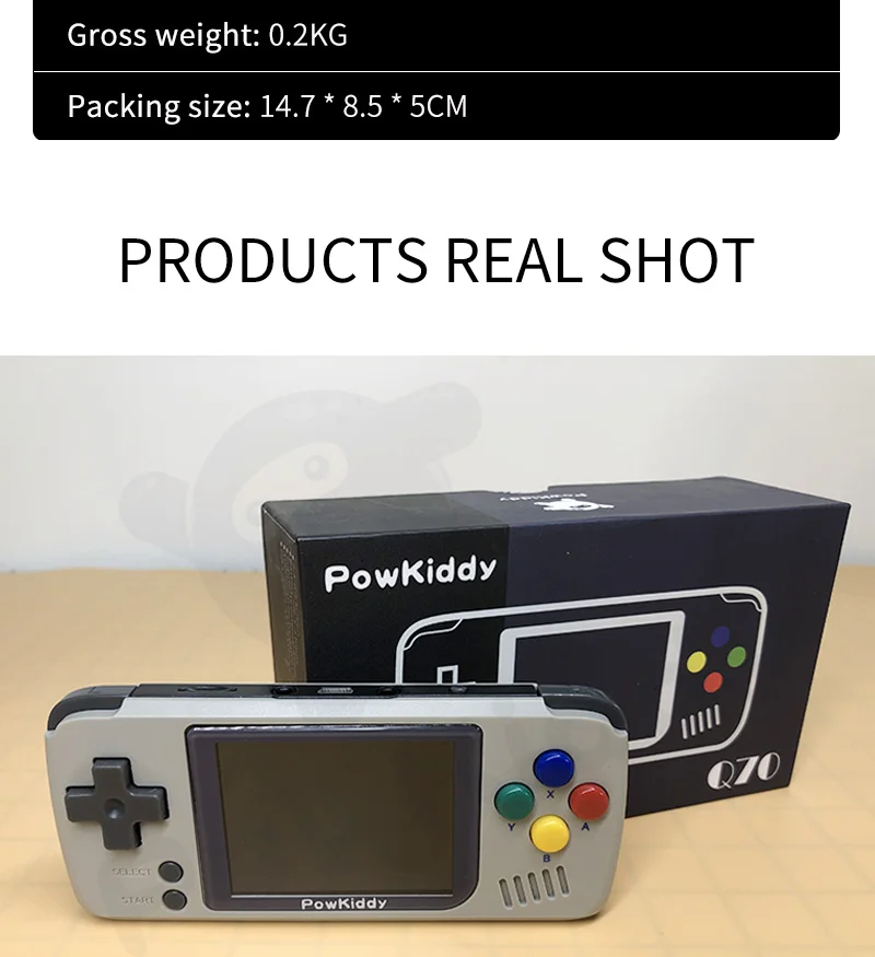 Buy one Get Free rainbow buttons!!At a glance?Play your favorite retro gaming classics High quality 2.4" IPS Display Screen (tempered glass)Supports save states, save then continue where you left off at any timeLoads games via Micro SD cardAdjustable screen brightnessL, R buttons, the volume dial Tips: When turning off the Q70, use the menu option to press power button, if you use the switch on the side it will damage the system when you start again.Product parameter