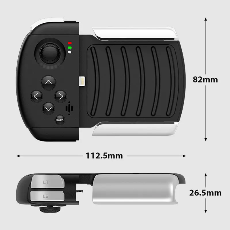 PUBG Gaming Controller For IOS Iphone Mobile Joypad No Bluetooth Required Telescopic Game Joystick One-Handed Gamepad Specification: Weight: 200g Product Name: Gamepad For iPhone Connection: Lighting System: IOS 7.0 and Above Input: DC 5V/2A Color: Black+Silver Size: 19.5cm x 11.5cm x 3cmNote: