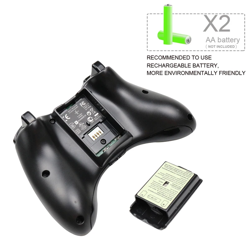 For xbox 360 2.4G wireless controller, it cames with 2.4G receiver, so you can connect for xbox 360/PC wirelessly. it also built-in dual vibration, it need 2 AA batteries (not included), and without headphone jack.