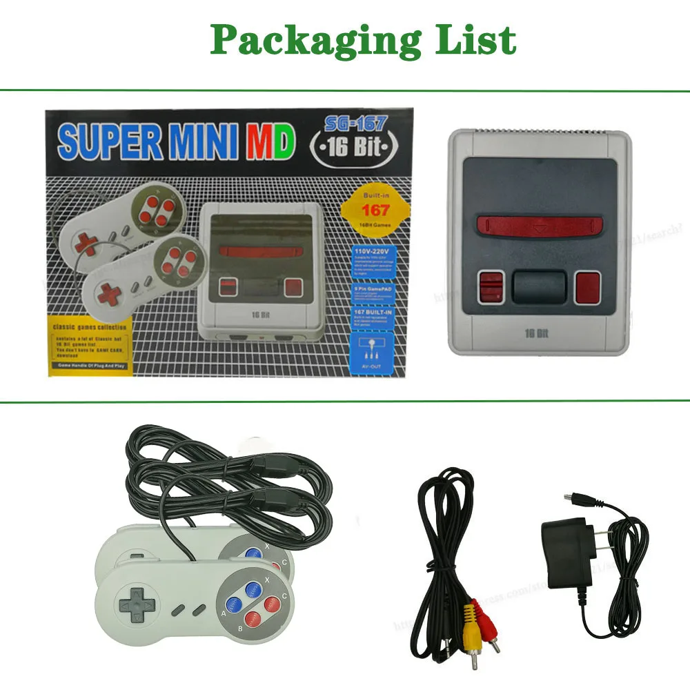 16 Bit Retro Mini Video Game Console 167 Classic Games TV AV-out For MD Sega SG-167 Family Handheld Game Player Child Gift Hot Description: 1. Enter AC 220V 2. Transformers are not toys.